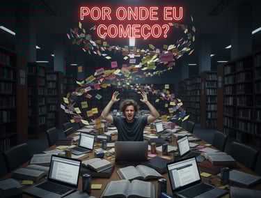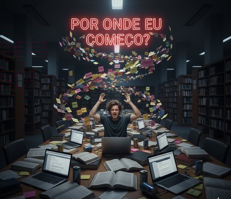 "Você já sentiu aquele nó no estômago ao abrir o notebook e perceber que o prazo está chegando, mas você ainda não escreveu uma única linha? A pressão do trabalho, o cansaço da família e a cobrança da faculdade parecem uma montanha que você não consegue escalar. Você não é preguiçoso. Você só está sem o mapa."